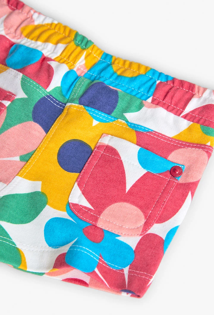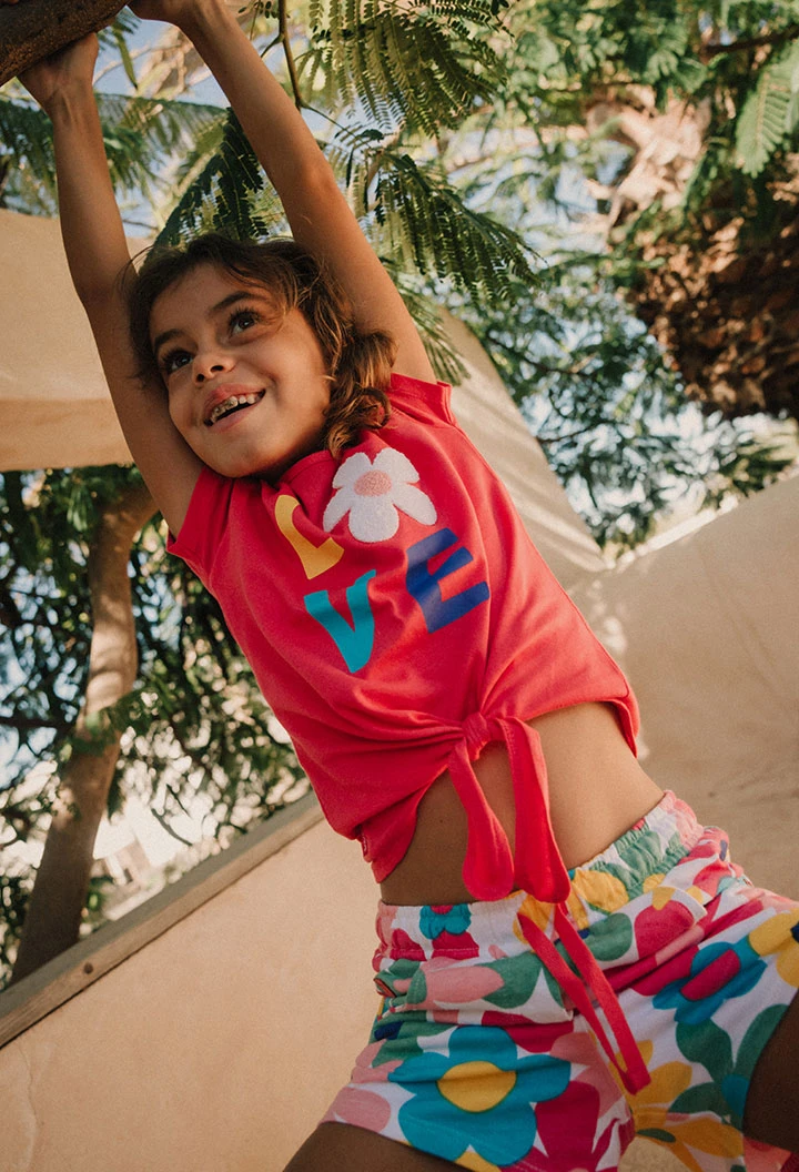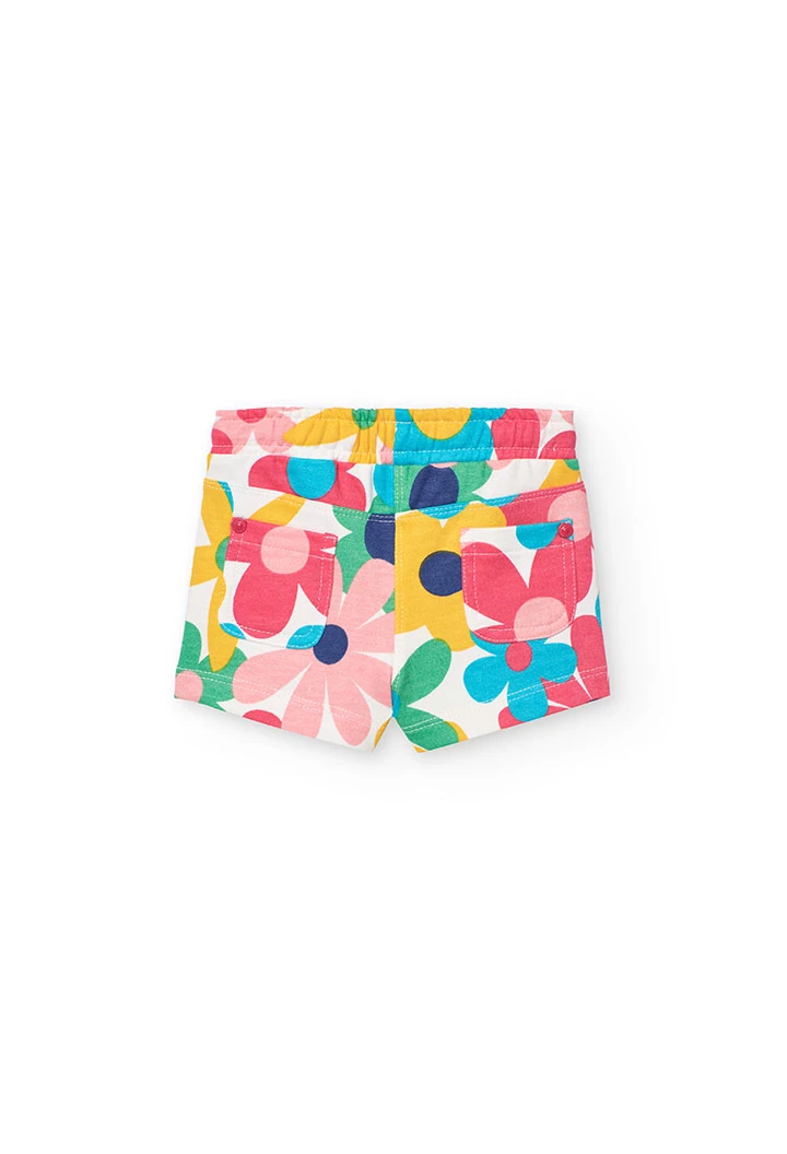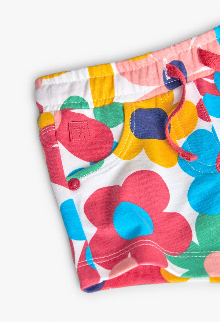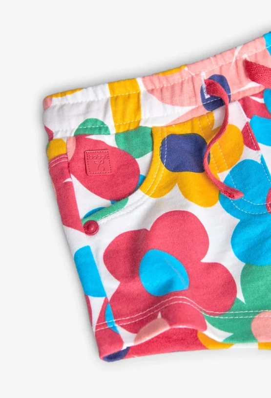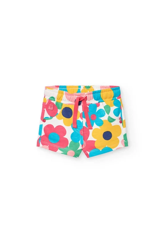 Estos son unos shorts de punto para niña en un color multicolor, perfectos para los días cálidos. Su tejido suave proporciona comodidad, ideal para uso diario. El diseño presenta un estampado vibrante de flores, lo que les da un toque alegre y divertido. Están disponibles en tallas que cubren un rango continuo desde los 2 años hasta los 8 años, adaptándose al crecimiento del niño. La cinturilla elástica con cordón permite un ajuste fácil y seguro. Estos shorts son ideales para combinarlos con camisetas de colores sólidos o a rayas, creando un look fresco y veraniego.